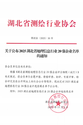 近日,從湖北省測(cè)繪行業(yè)協(xié)會(huì)傳來喜訊,武漢市政院憑借卓越的技術(shù)實(shí)力與行業(yè)貢獻(xiàn),成功獲評(píng)“2025湖北省地理信息行業(yè)20強(qiáng)”。這一榮譽(yù)標(biāo)志著公司在測(cè)繪地理信息領(lǐng)域的專業(yè)能力獲得省級(jí)權(quán)威認(rèn)可,為企業(yè)發(fā)展里程碑再添濃墨重彩。
