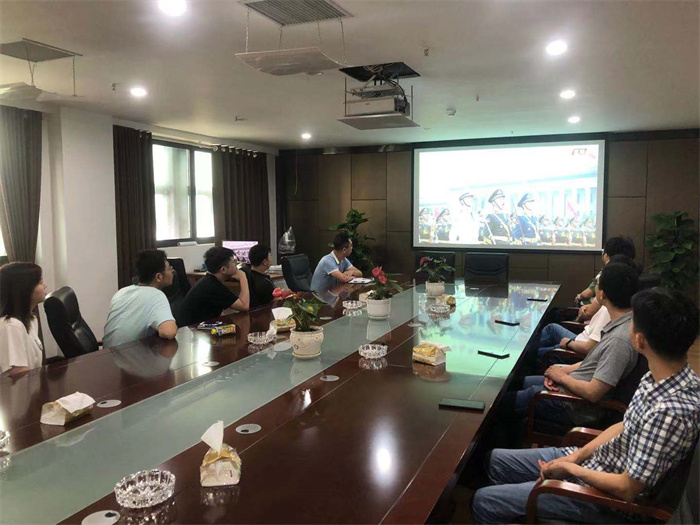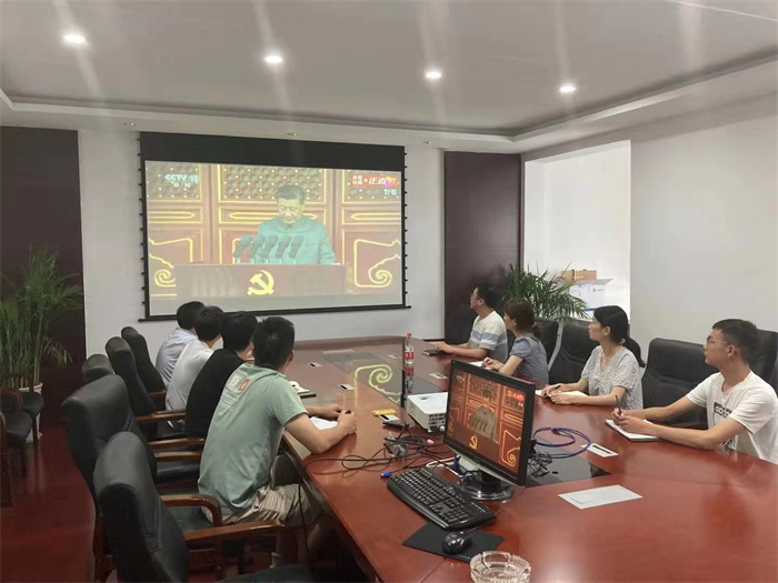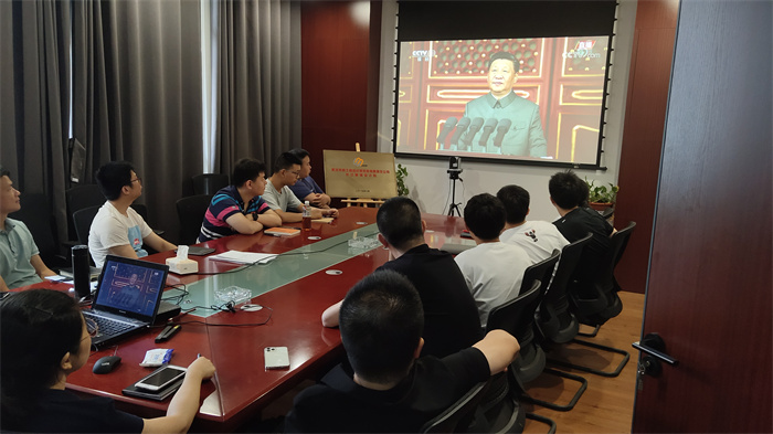 公司領導、總經理助理、駐總院辦公的部門負責人、支部書記在西四樓會議室集中收看大會盛況。大會伊始,在轟鳴的禮炮聲中,國旗護衛(wèi)隊護衛(wèi)國旗颯爽登場;全場肅立高唱《國歌》,高亢的旋律瞬間營造了莊嚴肅穆的氛圍;少先隊員和共青團聯(lián)合獻詞,回顧黨的光輝歷史,表達對黨的熱愛與忠誠。大會現(xiàn)場氣氛莊嚴,激昂奮進,讓收看的人仿佛置身現(xiàn)場,親臨盛典。